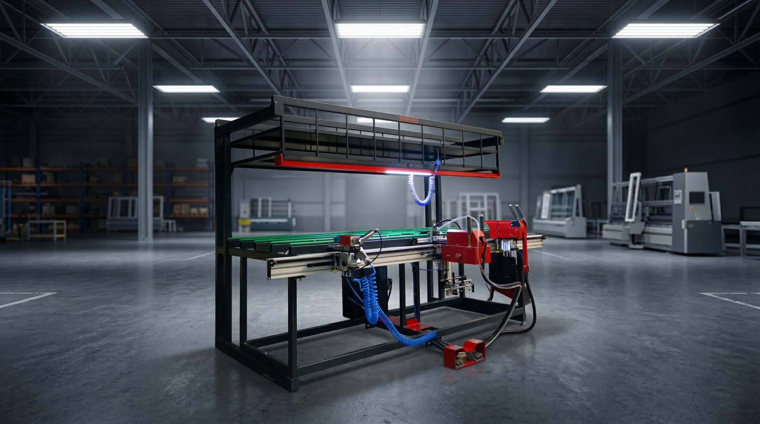 - vorgebaute Schraubeinheit in mehreren Arbeitshöhen arbeitend (Einwurftrichter für längere Schrauben / Eckbandverschraubung)